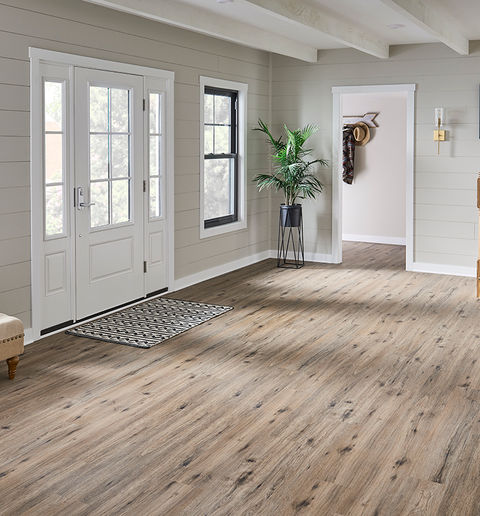Sandino Luxury Vinyl Planks from the Rigid Core Prescott Series offer a light brown color with subtle knots and grains for a neutral design that complements any design style. The authentic hardwood-look vinyl plank flooring comes with a commercial-grade wearlayer for enhanced durability and a pre-attached backing for extra comfort underfoot. The easy-click system makes installing the LVP flooring simple and straightforward, while the 100% waterproof 7x48 planks can be installed anywhere, including wet spaces like bathrooms, kitchens, and laundry rooms.