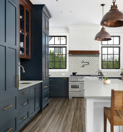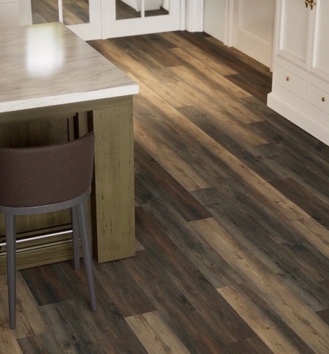 Bembridge Luxury Vinyl Planks from the Prescott Series feature high-variation shades of browns and grays with darker knots and grains. The low-maintenance 7x48 vinyl plank flooring is part of the Rigid Core line, a collection of 100% waterproof products that can be installed anywhere and come with an easy-install click system for simple installation. The LVP Flooring comes with a commercial-grade wearlayer and pre-attached backing for added comfort. The project can be completed with trim pieces that match the same look.